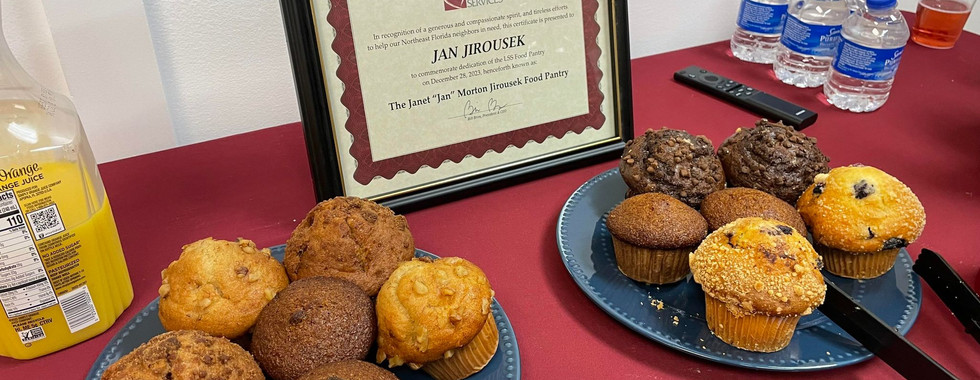 On Thursday, December 28th, Lutheran Social Services of Northeast Florida (LSS) unveiled a dedication wall honoring Janet “Jan” Morton Jirousek and the incredible Del Webb community for their unwavering support of the LSS Food Pantry. The unveiling took place at the LSS Food Pantry, 4615 Philips Highway, and marked a milestone in recognizing the efforts and selfless contributions of these individuals.